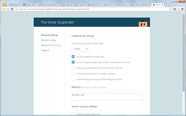 1. One of the reasons that Chrome sucks up your performance is that users often have a gazillion tabs and windows open. While convenient, each one is putting a load on your system trying to keep the content flowing. That's where The Great Tab Suspender comes in. It allows you to suspend tabs that you haven't been using recently. What makes it different than the one I was using before today is that it does all of it automatically based on an inactivity timeframe you set (from never to 20 seconds to 3 days) and then it will automatically bring them back to life when you click on it. It can also ignore pinned tabs, which includes my Gmail on my system, so that they are always running. It has already helped my computer be much happier with me, so I'm a big fan. |